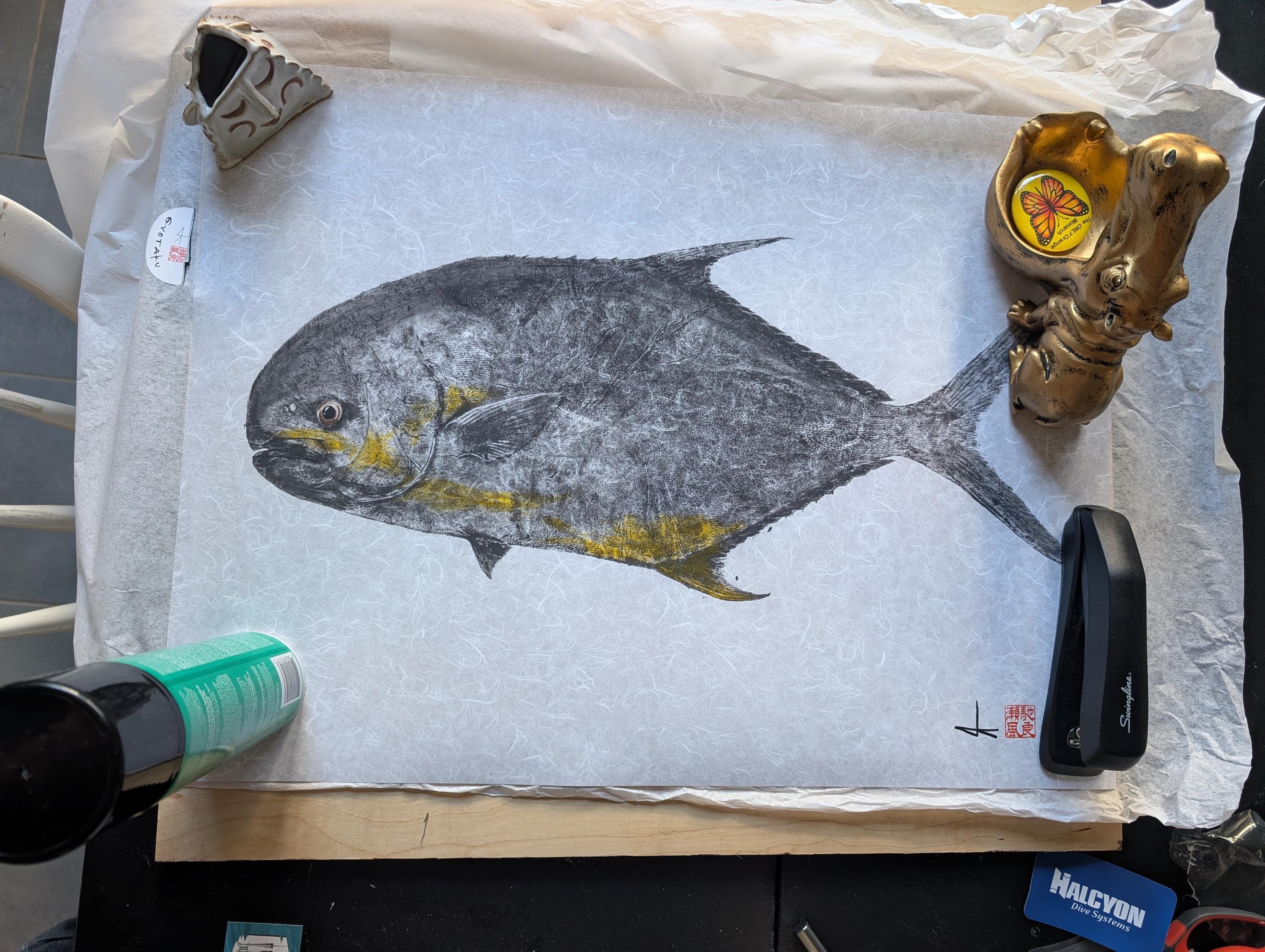 Permit Gyotaku Reproduction – Limited Edition Fish Art Print – Japanese Sumi Ink on Mulberry Paper – Yellow Variation Available